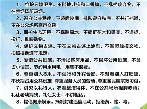 近年來(lái)隨著我國(guó)經(jīng)濟(jì)社會(huì)的發(fā)展和人民生活水平的提高,越來(lái)越多的人加入到旅游者的隊(duì)伍中。通過(guò)旅游,一方面可以飽覽祖國(guó)大好河山,擁抱美麗大自然,另一方面開闊視野、增長(zhǎng)知識(shí),享受美好生活。當(dāng)然在享受美景的同時(shí),還須注意自己的言行舉止,旅游是社會(huì)文明的窗口,尤其在出境游中,中國(guó)游客不僅代表的是個(gè)人形象,更代表國(guó)家形象。所以,要文明走天下,做文明旅游者。在此我們向廣大游客發(fā)出倡議: