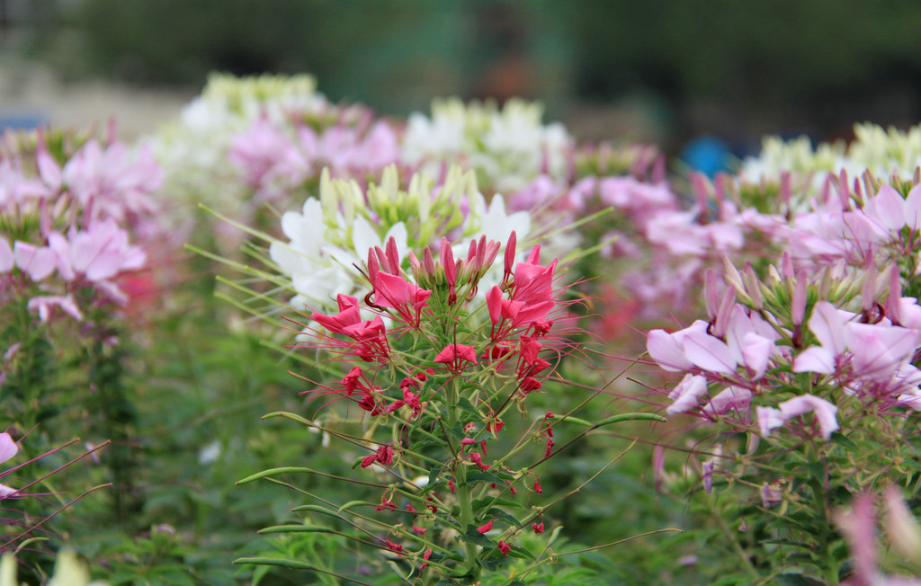 醉蝶花花梗長而壯實,總狀花序形成一個豐茂的花球,花形優(yōu)美別致,花瓣團圓如扇,花蕊突出如爪,形似蝴蝶飛舞,花色嬌艷,初為粉白,次轉(zhuǎn)粉紅,后變紫紅,一花多色,兼具蜜腺,常令飛蝶陶醉,故名。長長的雄蕊伸出花冠之外,形似蜘蛛,又如龍須,頗為有趣。醉蝶花開放時,花瓣慢慢張開,長爪由彎曲到從花朵里彈出,其過程如同電影快鏡頭慢放一般。